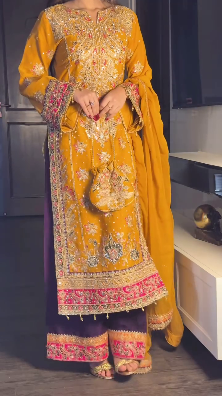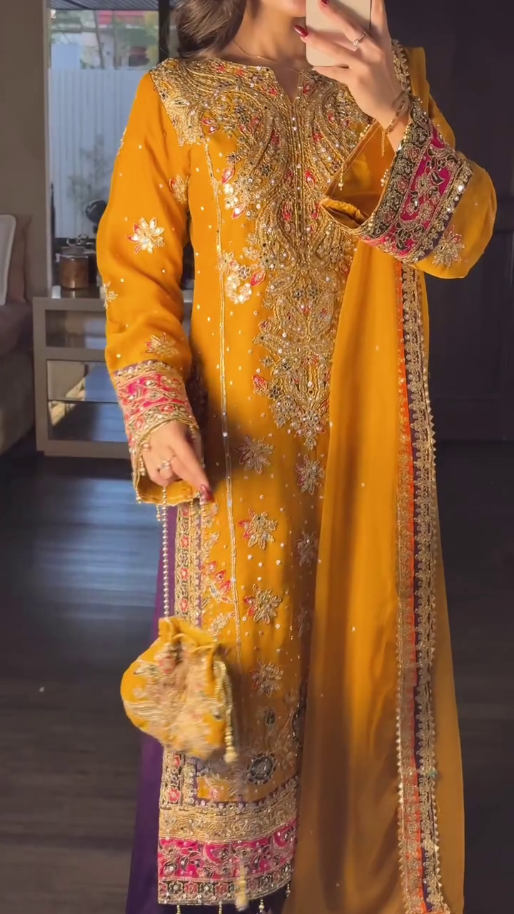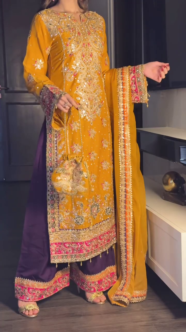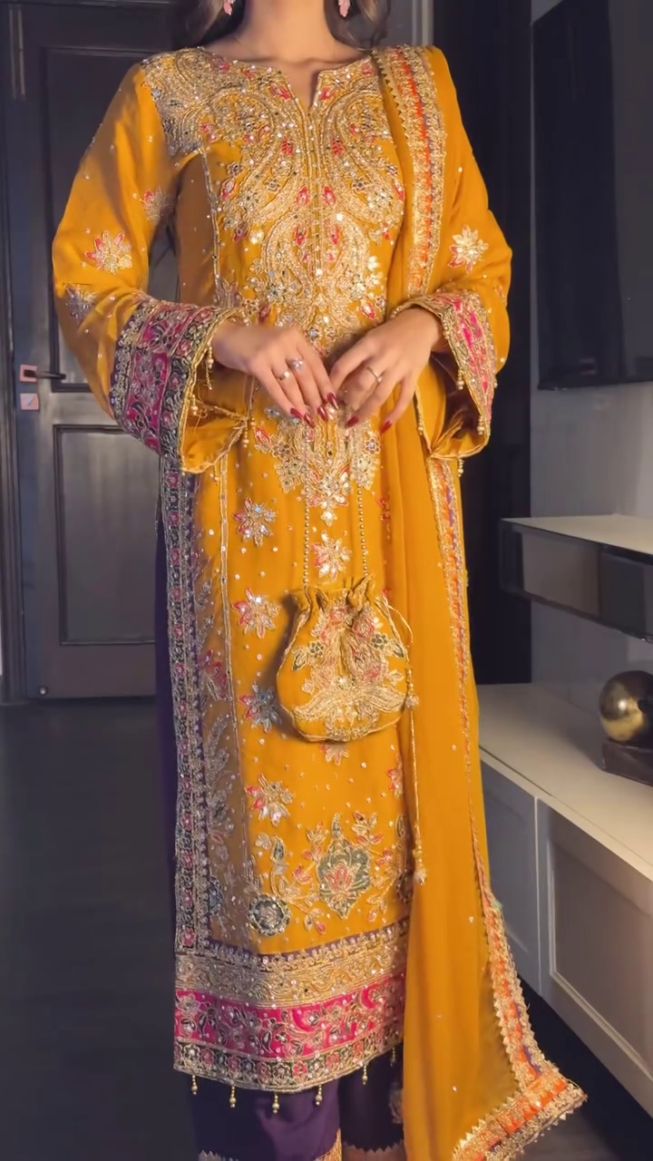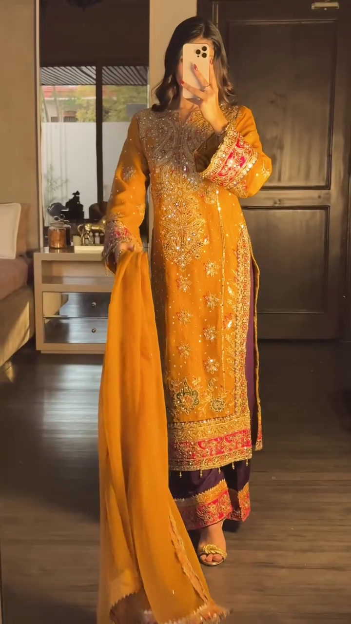 Radiating sheer grace and cultural richness, this golden mustard ensemble 💛 is a true masterpiece of traditional craftsmanship ✨—perfect for festive occasions 🎉 and wedding celebrations 💍. The kameez is adorned with intricate hand embroidery 🪡 in shimmering gold, silver & pink tones 🌸, beautifully enhanced with delicate mirror & sequin work 💎 that sparkles with every movement.