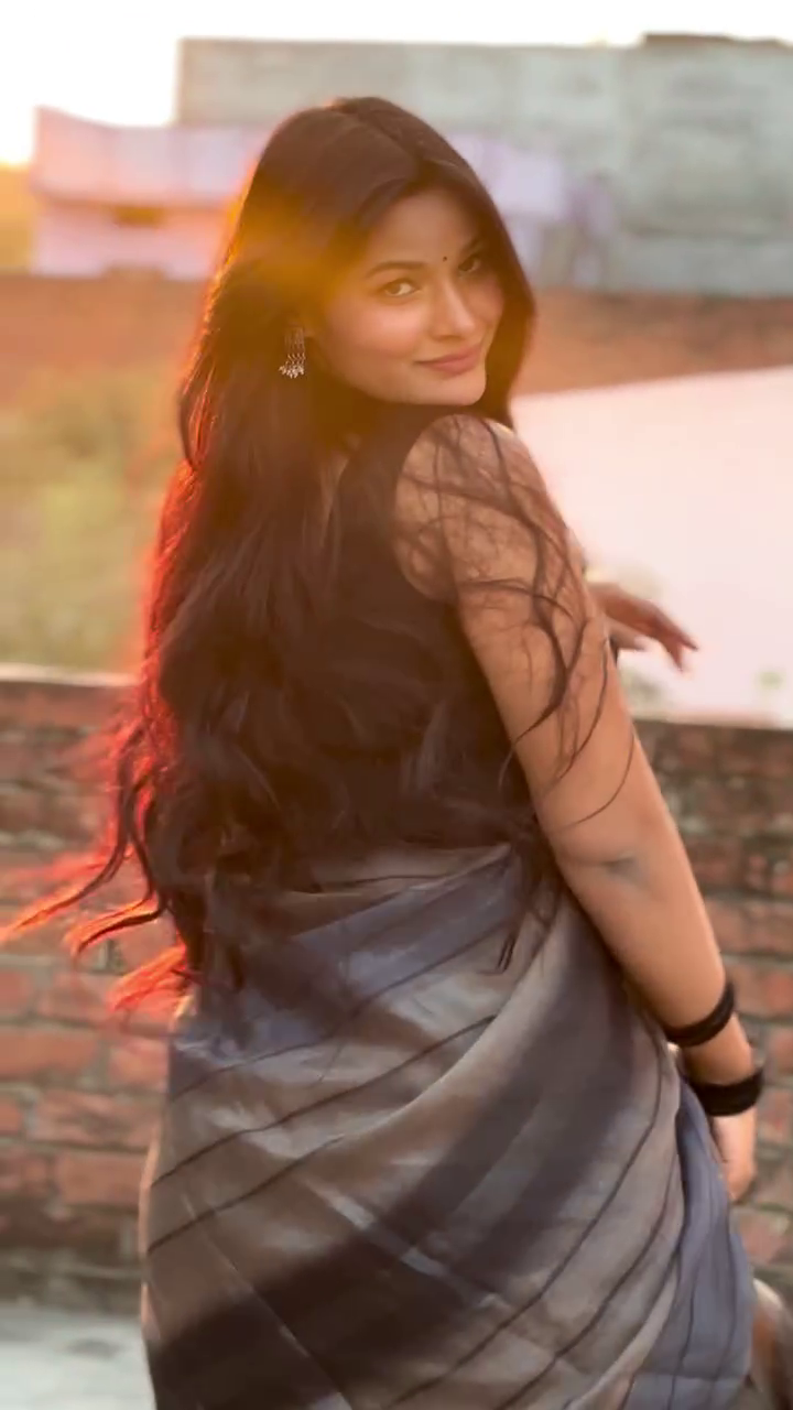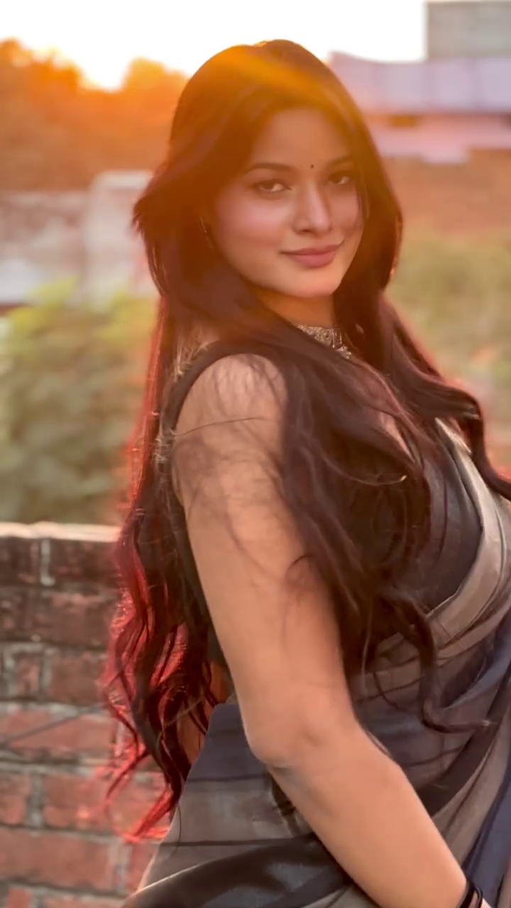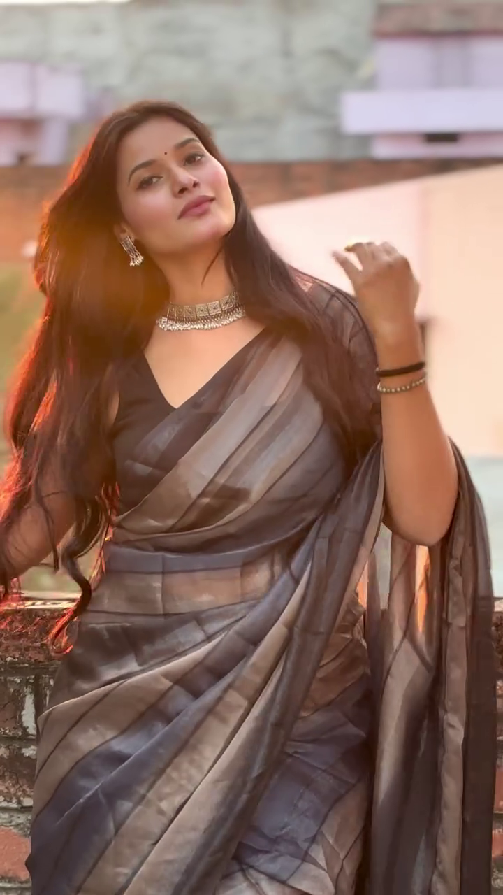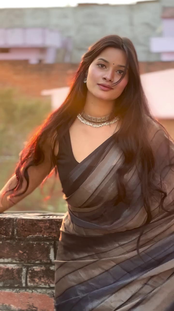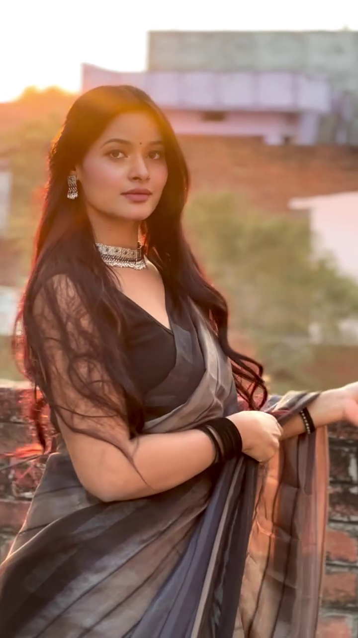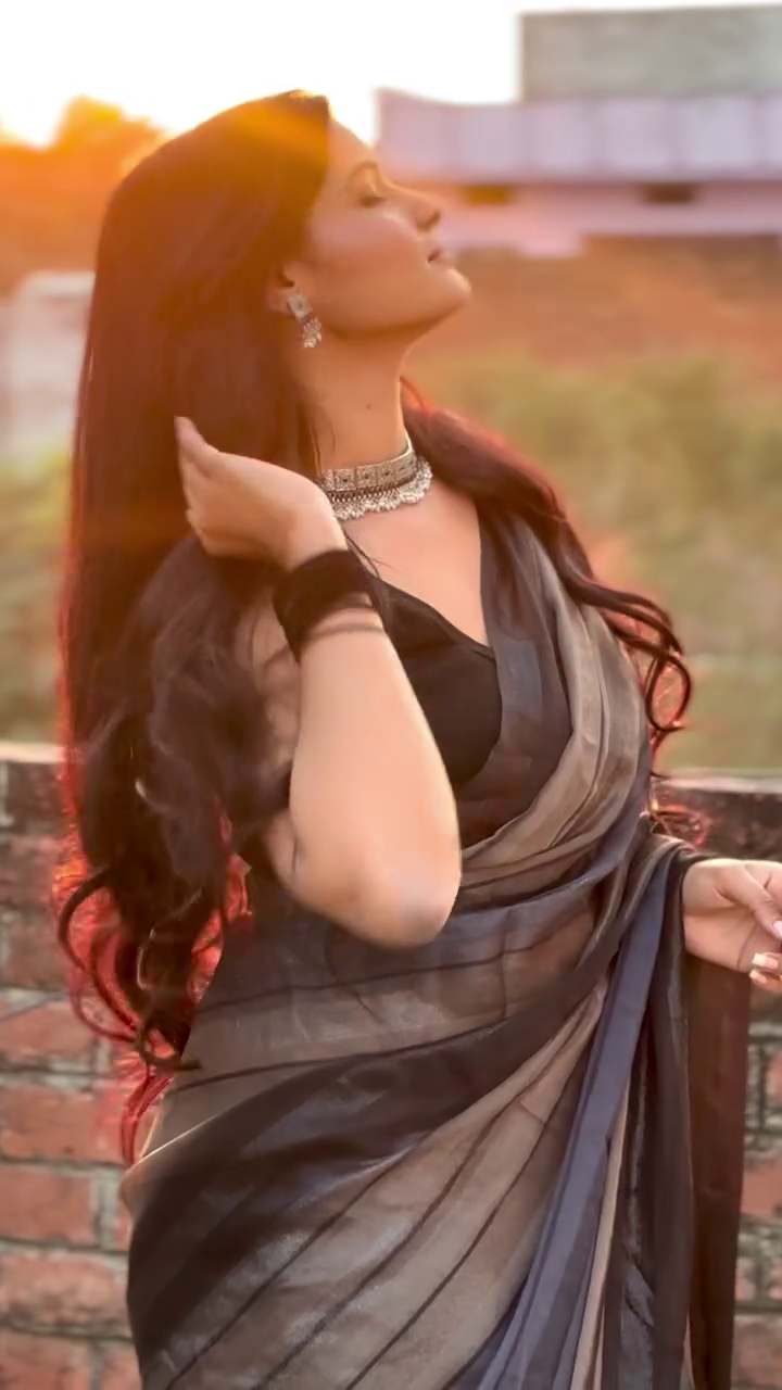 Accessorizing this saree is a delight. In the look pictured, the model complements it with a sparkling silver choker necklace, matching earrings, and black bangles — a combination that enhances the saree’s sophisticated vibe while adding a festive sparkle. The soft waves in her hair and the warm golden sunlight in the background elevate the overall aura, making the ensemble perfect for romantic evenings, wedding receptions, festive occasions, or cultural events.